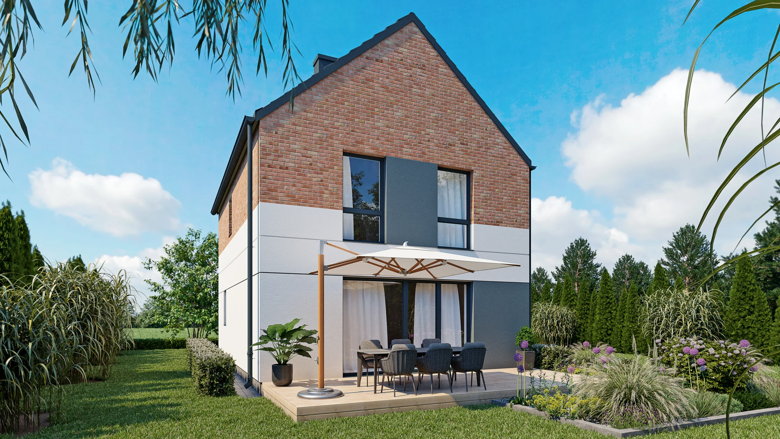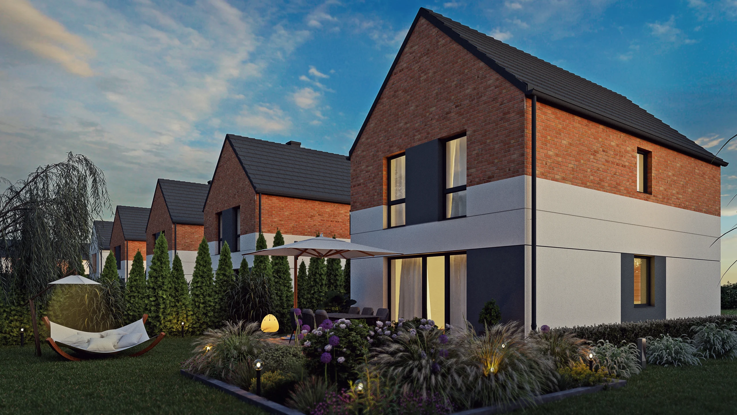 Każdy dom zapewnia prywatność, dostęp do światła i własną zieloną przestrzeń, która staje się naturalnym przedłużeniem wnętrza — miejscem do odpoczynku, zabawy z dziećmi i spotkań z bliskimi.